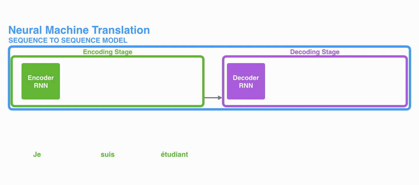 RNN 기반 모델 (LSTM, GRU)이 단어를 처리하는 방법은 아래와 같다. 인코더에서 입력 시퀸스를 컨텍스트 벡터라는 하나의 고정된 크기의 벡터로 압축하고, 디코더는 이 컨텍스트 벡터를 통해 출력 시퀸스를 만들어낸다.